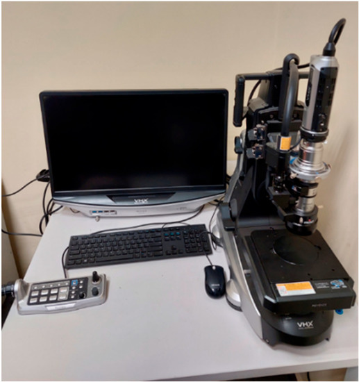The measurements were carried out using a diamond indenter with a regular tetrahedral shape and an apex angle of 120°. Six measurements were conducted for each sample, and two extreme results were discarded for subsequent calculations. The distance between individual measurements was three times greater than the diameter of the indentation to ensure that the results did not influence each other. At the final stage, surface roughness measurements were made by means of the Keyence VHX7000 digital microscope (Osaka, Japan) (Figure 7).