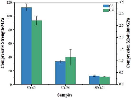 A compression test assesses the mechanical properties of porous Ti6Al4V scaffolds for medical implantation. Figure 2 illustrates the various samples’ compressive strength and compression modulus, which greatly varied and decreased as porosity increased. The sample 3D-60 with the biggest compressive strength is about 112 MPa and has the maximum elastic modulus. Further evaluation in Table 2 indicates that the sample models’ compressive modulus and yield strength declined concomitantly with increasing pore size. Calculate the elastic modulus for the three types of porous structures from 0.3 GPa to 2.7 GPa, which is much smaller than the traditional Ti6Al4V implant, which is about 110 GPa. We found that 3D-60 matches natural bone well, and the mechanical properties are much better than the other two samples. The greater the porosity and pore size, the more the samples’ mechanical properties are inferior. Therefore, we selected the 3D-60 model to further investigate modification, with a wire diameter of 5.0, a porosity of 60%, and a pore size of about 350 μm.