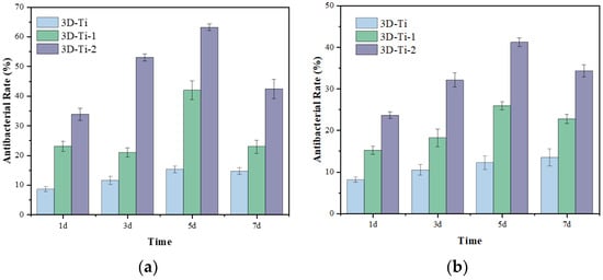 Although infections caused by bone implant material 3 months after surgery are usually caused by S. aureus [], we also tested for bacteriostasis with E. coli. As shown in Figure 7b, it can be found that the antibacterial trend of the samples against the two bacteria is consistent, and the long-term antibacterial activity of the samples has been improved to a certain extent after secondary anodizing. At the same time, it was found that Staphylococcus aureus was more likely to be killed, possibly due to differences in cell walls [], but the specific reasons for this should be the subject of our follow-up research.