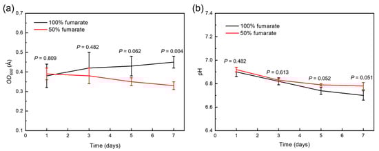 (a) Growth curves of S. algae and (b) pH variation in various fumarate concentration medium.