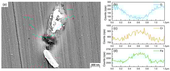 Figure 2 shows the SEM images of the 201 SS coupons immersed in the 100% fumarate medium inoculated with S. algae. After 1 day of immersion, the bacteria dispersed on the 201 SS surface and aggregated on local areas of the surface (Figure 2a). As the immersion time reached 3 days, the density of bacteria on the surface increased (Figure 2b). After 7 days of immersion, the number of sessile bacteria further increased and localized dense biofilms formed (Figure 2c). Some corrosion pits were observed around the sessile bacteria on the coupon’s surface (Figure 2d and Figure 3a). Within the area spanning the corrosion pit (white dashed line), an EDS line scan was performed on Fe, Cr and O elements and the results are shown in Figure 3b–d. The O element content in the corrosion pit area was only 20% of that in the other regions, while the corresponding Fe and Cr element contents were increased by approximately 15%. The line scan results were caused by the rupture of the passive film on the 201 SS surface, which led to the exposure of the underlying substrate.