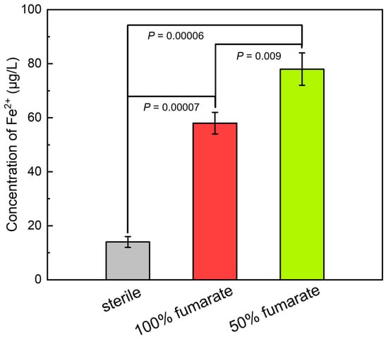 Figure 4 presents the concentration of Fe2+ in the sterile and inoculated media after 7 days of immersion. After immersing in the sterile medium for 7 days, the concentration of Fe2+ was approximately 14 μg/L, which indicated that the 201 SS only slightly corroded under abiotic conditions. Correspondingly, the concentration of Fe2+ in the 100% fumarate and 50% fumarate media under biotic conditions reached 58 μg/L and 78 μg/L, respectively. The significant higher concentration of the Fe ion leaching confirmed that the presence of S. algae could accelerate the corrosion of 201 SS in an anaerobic environment and the MIC was further enhanced with the lack of electron acceptor.