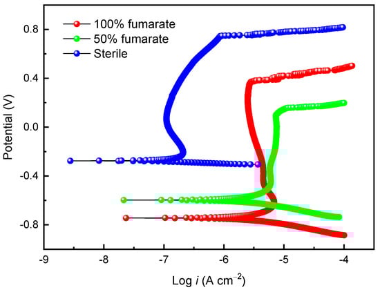 Figure 5 shows the potentiodynamic polarization curves of the coupons in the sterile medium and the inoculated media with various fumarate concentrations after 7 days of immersion. After immersing in the sterile medium for 7 days, the passivation current density (ipass) of 201 stainless steel was 0.13 μA and the pitting potential (Epit) was 0.76 V, indicating good corrosion resistance of the steel in the sterile medium. In comparison to the sterile medium, the ipass of the coupon in the 100% fumarate medium inoculated with S. algae increased to 3.3 μA and Epit decreased to 0.37 V. When the electron acceptor in the culture medium was halved, the Epit of the 201 SS coupon further decreased to 0.15 V, while ipass increased to 7.2 μA. The results from the potentiodynamic polarization curves indicate that S. algae cells accelerated the degradation of the passive film. The lack of an electron acceptor made the biofilm more corrosive to the passive film. These results were consistent with the ICP results.