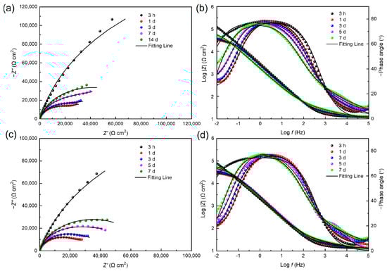 Nyquist and Bode plots for 201 SS coupons immersed in the (a,b) 100% fumarate medium and (c,d) 50% fumarate medium.