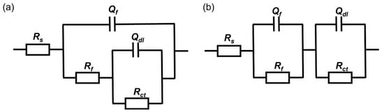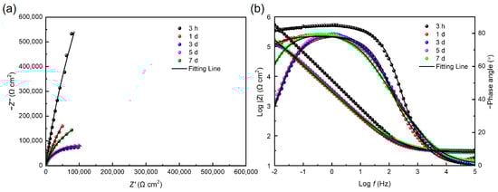 The equivalent electrical circuit in Figure 7a was used to fit the EIS results of coupons immersed in both media for 3 h, 1 day and 3 days. With the thickening of the biofilm, resulting in the increase in |Z|0.01 Hz and the diameter of the capacitive loops, the equivalent electrical circuit in Figure 7b was used to fit the results after 5 and 7 days of immersion. The constant phase element Q is usually used instead of a pure capacitance to fit non-ideal films on the surface. Rs represents the solution resistance. Qf and Rf are related to the capacitance and resistance of the surface film consisting of the biofilm and the passive film, respectively. Qdl is the capacitance of the electrical double layer and Rct reflects the resistance of the charge transfer resistance.
