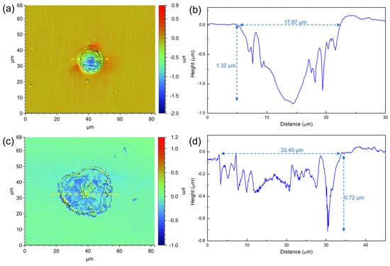 The morphology of the maximum corrosion pit on 201 SS coupons after 7 days of immersion (a,b) in the 100% fumarate medium and (c,d) the 50% fumarate medium. The yellow dashed lines mark the location of the line scan results of depth. The blue dashed lines mark the width and the depth of corrosion pits.