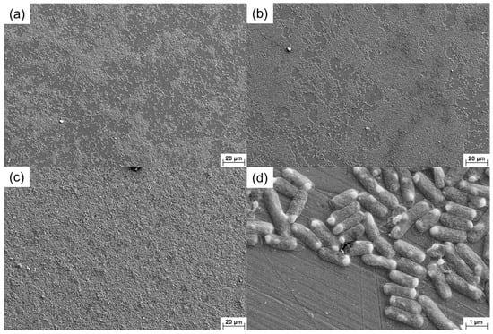 SEM images of the 201 SS immersed in the 100% fumarate medium inoculated with ΔOmcA for (a) 1 day, (b) 3 days and (c,d) 7 days.