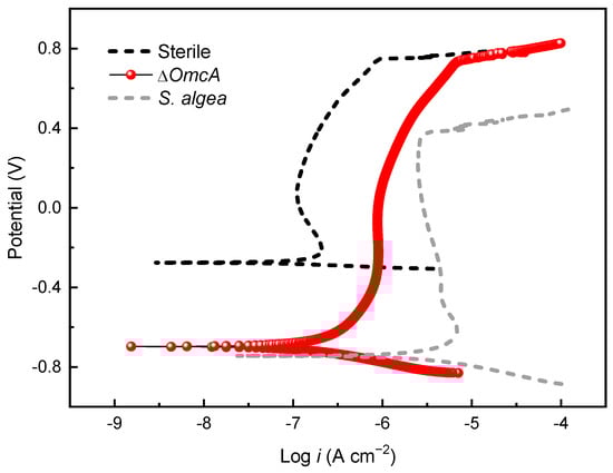 Figure 10 presents the potentiodynamic polarization curve of the 201 SS coupon in the medium inoculated with ΔOmcA after 7 days of immersion. Compared to the coupon immersed in the sterile medium, the coupon immersed in the ΔOmcA-inoculated medium with 100% fumarate showed nearly identical Epit (0.74 V), which was significantly higher than that immersed in the S. algae-inoculated medium (0.37 V). The coupon in the ΔOmcA-inoculated medium had an ipass of 1.12 μA, which falls between the ipass values of coupons immersed in the sterile medium and the S. algae-inoculated medium. ΔOmcA cells slightly accelerated the MIC of the steel, but it was much weaker than that mediated by S. algae.