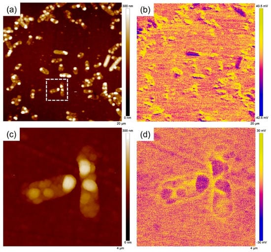 (a) AFM topography and (b) VCPD potential distribution on 201 SS surface after 3 days of immersion. (c,d) The corresponding results of the enlarged area are outlined by the white dashed line.