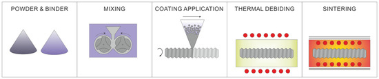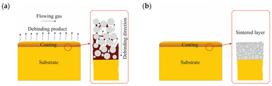 27]. The pores in the total volume of injection molded samples can be partially opened by removing one of the polymer components, i.e., paraffin. However, the low-thickness surface layers require only the binder’s thermal decomposition [