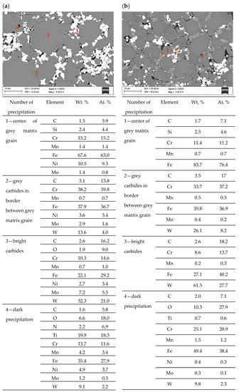 Figure 9 shows carbide steels 316 L/TC and 430 L/TC produced by injection molding powders and sintered at 1250 °C. Comparing the structure of both materials, it can be seen that similar phases are separated in both materials. Grey carbides rich mainly in Cr, Fe and W are marked in both carbon steels as No. 2. Light carbides are rich mainly in W but also in Fe and Cr labelled as No. 3. There are also fine dark precipitates rich in nitrogen, carbon, and oxygen and titanium in these materials. Due to the small particle size, the Cr and Fe content may partly come from the matrix. The chromium concentration in the 430 L/TC carbide matrix is lower than that in the 430 L steel powder, and its mass fraction is 13.9 and 16.5%, respectively. Similarly, in 316 L/TC carbide, chromium concentration in the matrix decreases from 17.3 to 15.2%. This results from the precipitation of carbides rich in this element and the depletion of the matrix, which is a typical effect in stainless steels with a high concentration of carbon. Corrosion tests were also performed on injection molded samples because their surface is flatter and regular. The results of corrosion tests (