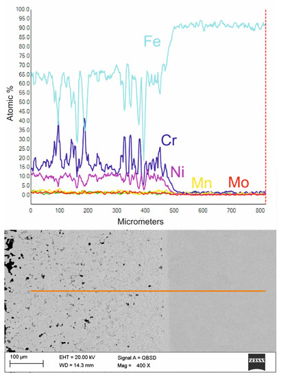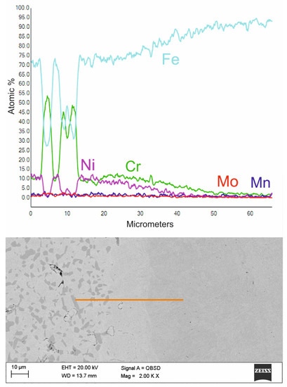 Figure 11 shows an enlargement of the area of the surface layer-substrate boundary with a clear diffusion zone in which there are no carbides but an apparent increase in the concentration of chromium and nickel. It is a layer with a thickness of approx. 15 mm, which separates the substrate from the layer of 316 L steel. The structure of the layer in this figure is rich in carbides, which confirms the thesis that the concentration of residual carbon in this area should be high, which initiates the sintering process of the surface layer with the substrate. Observing the structure of the surface layer on the surface of the sample, it can be seen that it is more porous. Therefore, paraffin degradation in this area is more accessible, and the proportion of residual carbon is lower or absent. Also, the share of carbides in this area is smaller, as evidenced by the Cr concentration distribution presented in the linear distribution of elements. Unfortunately, the porous structure may reduce corrosion resistance. However, it is still higher than the substrate, as confirmed by