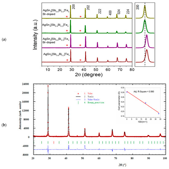 The inset in Figure 1b shows the a-lattice parameter as a function of Ag[Sb0.8Bi0.2]Te2% plotted in the form of the 100/(1 + m) molar ratio. This linear dependence has previously been observed for AgSnxBiTex+2 and AgSnmSbSe2Tem systems [15,23].