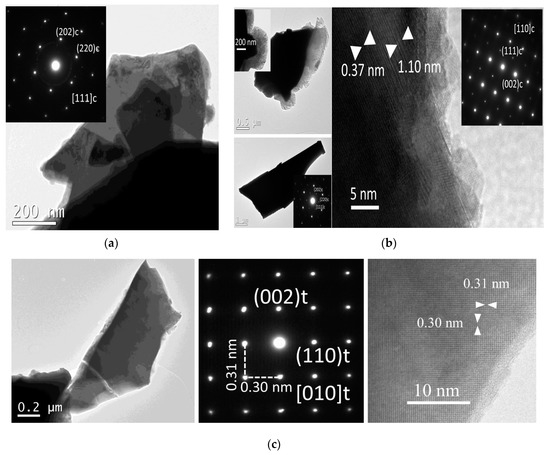 HRTEM analysis and electron diffraction (ED) patterns show the microstructural characteristics of the telluride samples. Small crystals of between 1 and 5 µm with irregular shapes are observed. ED patterns obtained along the [111]c and [110]c zone axes for different selected regions of AgSn2[Sb0.8Bi0.2]Te4 and AgSn4[Sb0.8Bi0.2]Te6 are shown in Figure 3a,b.