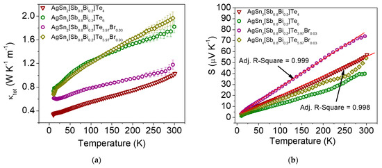 Temperature dependence of (a) total thermal conductivity κtot and (b) Seebeck coefficient S as a function of temperature for AgSnm[Sb0.8Bi0.2]Te2+m and Br-doped phases. The solid red lines show representative linear fits to the experimental data in the low-temperature range.