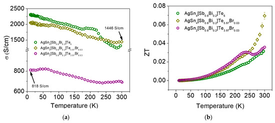 Temperature dependence of (a) the electrical conductivity (σ) and (b) figure of merit (ZT) for AgSnm[Sb0.8Bi0.2]Te2+m and Br-doped phases.