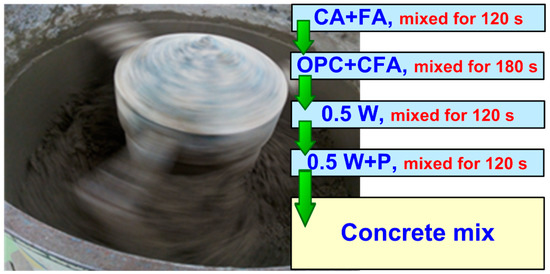 A laboratory concrete mixer with a 100 L capacity was utilized in the preparation of all concrete mixtures. The scheme, including all steps in this procedure, is shown in Figure 2.