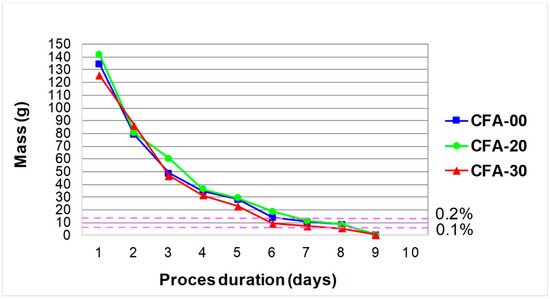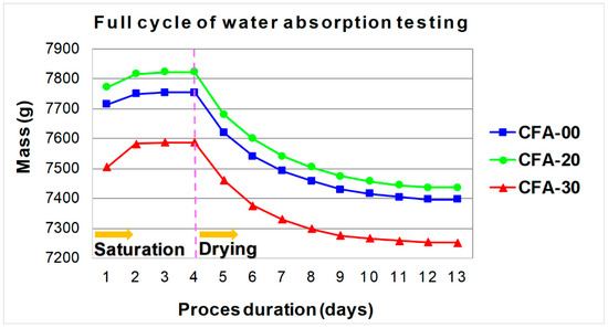 Therefore, water absorption of the hardened concrete is one of its basic qualitative features, which is taken into account already at the stage of designing the composition of the concrete mix [67]. In addition, as reported in [68,69,70,71], minimizing water absorption of concrete is important in order to reduce the ingress of chloride-containing or sulfate-containing water into concrete, which can cause serious damage and reduce its durability. Considering the above, it should be stated that a thorough knowledge of the water absorption phenomenon in the case of concretes containing CFA is of decisive importance in the context of forming their durability.