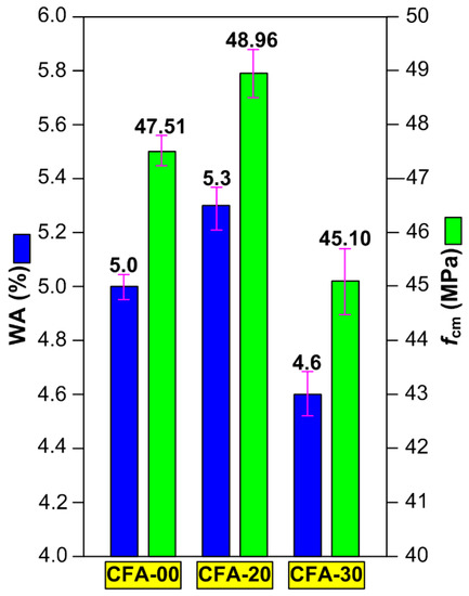 - Lower water absorption level with obviously still lower compressive strength than in the reference concrete and composites with CFA content below 30% [64,91,92,94].