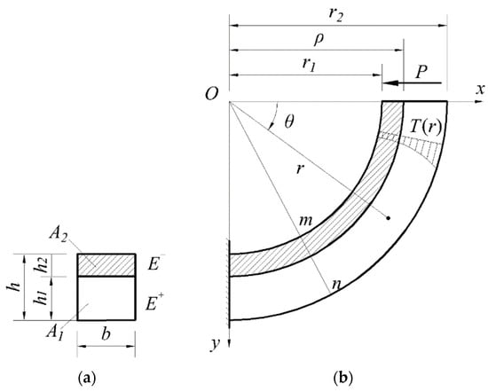 A curved beam with a rectangular section type was subjected to the concentrated shear force P at one end and was fully fixed at another end, as shown in Figure 4. The polar coordinate system rOθ and the rectangular coordinate system xOy were combined to describe this problem. For any point of the beam, its polar radius was denoted by r and its polar angle by θ, whose positive rotation direction was defined as: from the positive half x-axis to the positive half y-axis; that is, the positive rotation direction was clockwise, as shown in Figure 4b. The inner radius of the curved beam was denoted by r1, the outer radius by r2, and the curvature radius of the neutral layer by ρ, which was unknown at present. Due to the constraint of the structure, under a certain temperature field, the expansion and contraction caused by temperature changes will not be able to develop freely, resulting in the so-called thermal stress. Without loss of generality, we assume the temperature change is only along the radial direction, this is, T = T(r); in fact, this simple case is also very common in real problems. For example, in a ring or cylinder in a thermal environment in mechanical engineering, its heat distribution generally changes along the radial direction; thus, there are many thermal phenomena like this. In Figure 4b, mn stands for any cross-section whose section type is as shown in Figure 4a, in which the height of the cross-section is denoted by h and the width of the cross-section by b. Bounded by the neutral layer, the whole beam, or the cross-section, was divided into two parts; the bottom of the cross-section, or the outer part of the whole beam, was tensile, while the top of the cross-section, or the inner part of the whole beam, as shown by the shadowed area, was compressive, as shown in Figure 4. In Figure 4a, h1 and h2 denote the tensile height and the compressive height of the section, respectively; A1 and A2 denote the tensile area and the compressive area of the cross-section, respectively; E+ and E− denote the tensile modulus and compressive one, respectively.