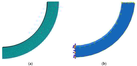 - The establishment of a solid model of curved beam, according to the geometrical sizes of the curved beam from Table 1, also see Figure 5a;