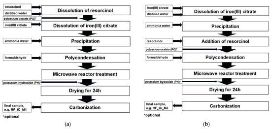 Schemes representing the preparation of carbon spheres modified with iron citrate added after and before resorcinol addition, with optional activation using potassium oxalate or potassium hydroxide are presented in Figure 1.
