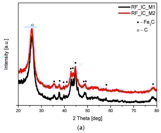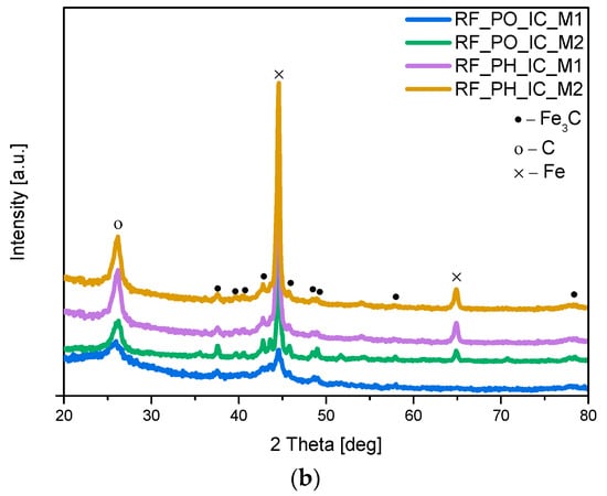 The XRD spectra of the samples activated with potassium oxalate (RF_PO_IC_M1; RF_PO_IC_M2) or potassium hydroxide (RF_PH_IC_M1; RF_PH_IC_M2), and modified with iron citrate are shown in Figure 2b. In the activated samples, similar to the case of nonactivated materials, the presence of carbon (ICDD 00-041-1487) and iron carbide (ICDD 00-006-0688) was confirmed. It should be noted that the reflection peaks corresponding to Fe3C had lower intensity in comparison with the nonactivated samples and contrary to the unmodified materials; the main observed crystallographic phase for the activated material was metallic Fe iron (ICDD 01-087-0721). The presence of reflection peaks corresponding to Fe (200) at 2θ = 65° and to Fe (110) at 2θ = 44.5° was noticed for all the samples; however, in RF_PO_IC_M1, the intensity of iron signals was the lowest.