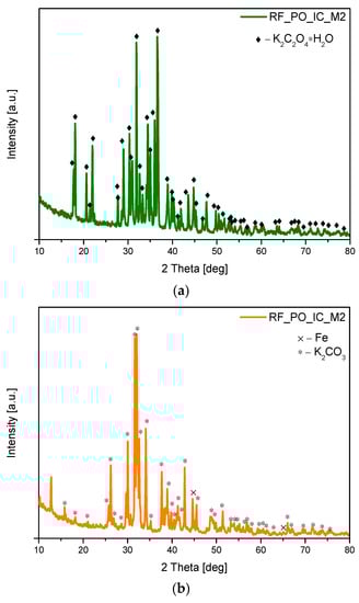 In the case of our activated samples, the analysis of the diffraction patterns of sample RF_PO_IC_M2 carried out after treatment in the microwave reactor, but before the carbonization process, showed that only potassium oxalate-hydrate [ICDD 00-022-1232] (Figure 3a) was present. However, in the same sample after heating in the furnace (but before rinsing with distilled water), mainly the phase of the potassium carbonate [ICDD 01-071-1466] was observed (Figure 3b). At this stage of the synthesis, we also observed the presence of reflexes belonging to iron (ICDD 01-087-0721). The presence of pure iron in the activated samples is probably due to the decomposition of organic compounds containing iron in their structure [,].