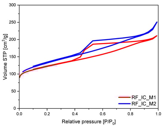 The low-temperature (−196 °C) nitrogen adsorption data were used to evaluate the specific surface area according to the BET method, as well as the porosity of the obtained composites. The specific surface area (SBET), total pore volume (TPV), the volume of micropores (Vm < 2 nm), and volume of mesopores (Vmeso) of the obtained materials were determined. The calculated results are shown in Table 1. The SBET of the nonactivated samples, calculated using the isotherms presented in Figure 5, was equal to 400 m2/g and 439 m2/g for RF_IC_M1 and RF_IC_M2, respectively. Differences were also observed in the case of the total pore volume results. In the material modified using the M1 method, TPV was equal to 0.33 cm3/g; in the material modified using the M2 method, TPV was 0.39 cm3/g. The shape of both isotherms indicates the micro-mesoporous character of the obtained materials []. The nitrogen isotherms obtained for these materials had an H2-type of the hysteresis loop, indicating the significant presence of mesopores in the sample.