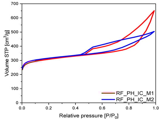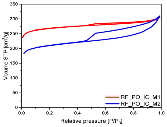 The shapes of N2 adsorption isotherms for PO-activated samples are presented in Figure 7. Considering that the type II adsorption isotherm for the M2 method sample had a noticeably wider H4 type hysteresis loop as compared to the sample prepared via the M1 method, the RF_PO_IC_M2 material had a significantly greater contribution of mesopores as compared to the M1 alternative. The N2 adsorption–desorption isotherm of RF_PO_IC_M2 showed two typical regions: first, a sharp increase at low pressure (P/P0) < 0.01 confirmed the presence of micropores; another region, which may be considered as an interval (P/P0) = (0.45; 0.99), presented a large hysteresis loop indicating the existence of mesopores []. In this sample, the shape of the hysteresis loop can be attributed to the presence of narrow slit-like pores [].