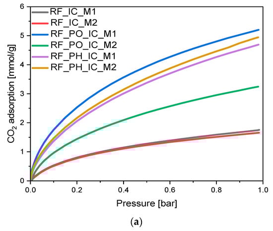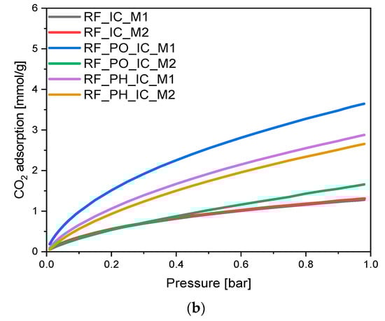 Both in the case of nonactivated and PH-activated materials, similar differences in CO2 adsorption values were observed. For nonactivated samples, CO2 adsorption at 0 °C was equal to 1.76 mmol/g and 1.66 mmol/g for RF_IC_M1 and RF_IC_M2, respectively, indicating higher uptake of CO2 for the M1 type of sample. This tendency was paralleled by the materials RF_PH_IC_M1 and RF_PH_IC_M2, where carbon dioxide adsorption values were equal to 4.94 mmol/g and 4.69 mmol/g, respectively. For both pairs of samples, the difference between uptake values approximated 5% of the value characteristic for the M1 method sample. Ultramicropores are the most relevant structure in the process of adsorbing carbon dioxide molecules; thus, these results indicate that the rate of ultramicropores creation by potassium hydroxide is not highly affected by the applied method of synthesis. Additionally, it is also visible that the significant increase in mesopore content in sample RF_PH_IC_M2 did not improve its adsorption capacity; therefore, it can be confirmed that the lack of significant differences between the Vs and Vm volumes in the case of both methods resulted in the lack of differences in the CO2 adsorption values.