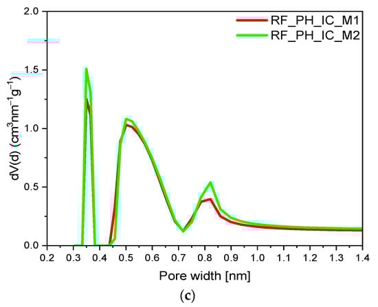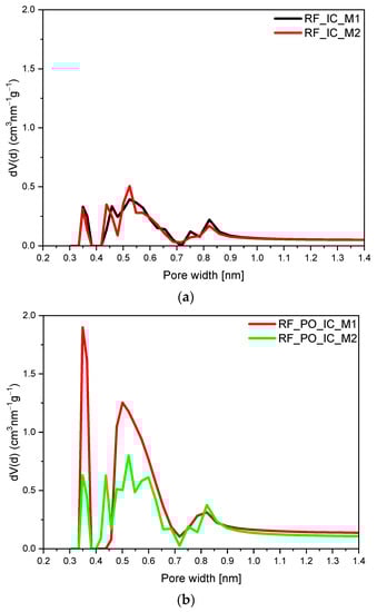 On the basis of the results presented in Table 1, it was found that the different TPV values were associated with the differences in the content of mesopores in the samples. A large volume of mesopores was found for the sample modified using the M2 method, equal to 0.25 cm3/g, whereas, for the sample modified using the M1 method, the volume of mesopores was 0.20 cm3/g. Simultaneously, no significant differences were found between the volume of micropores and the volume of ultramicropores in the case of both materials. The volume of micropores was equal to 0.13 cm3/g and 0.14 cm3/g for RF_IC_M1 and RF_IC_M2, respectively, whereas the volume of ultramicropores was equal to 0.11 cm3/g and 0.10 cm3/g for RF_IC_M1 and RF_IC_M2, respectively.