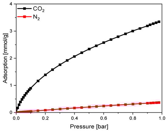 The results of the comparison of carbon dioxide and nitrogen adsorption on sample RF_PO_IC_M1 are shown in Figure 10.