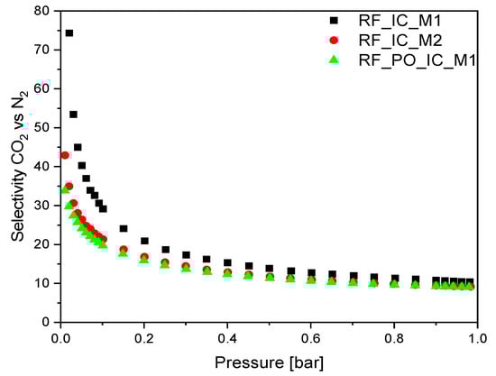 The CO2/N2 selectivity calculated for the samples with the highest SIAST values is presented in Figure 11. In the case of nonmodified materials RF_IC_M1 and RF_IC_M2, the highest CO2/N2 selectivity ratio at 0.1 bar was 74 and 43 respectively, whereas, for the activated material RF_PO_IC_M1, this value reached 34. As the pressure increased, the selectivity decreased rapidly to ~0.3 bar reaching values of 10.44, 9.15, and 9.04 corresponding to RF_IC_M1, RF_IC_M2, and RF_PO_IC_M1 at a pressure of ~1 bar.