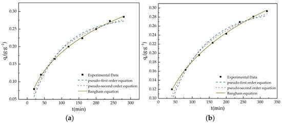 In order to further explain the adsorption process of weak polar toluene for MBAC, the data were fitted using kinetic models to investigate the adsorption mechanism. Fitting and analyses of kinetic data were carried out using a pseudo-first-order equation and pseudo-second-order equation. The pseudo-first-order equation is used to describe the physical adsorption process. The arrival of adsorbent from solution to adsorbent surface is controlled by a diffusion step [25], and there is only one binding site on the adsorbent surface. The pseudo-second-order equation is mainly used to describe the physical and complex chemisorption process [12]. There are two binding sites on the surface of the adsorbent controlled by the chemisorption mechanism. The nonlinear form of the equation of the pseudo-first and pseudo-second order dynamical model is given as follows [49]: