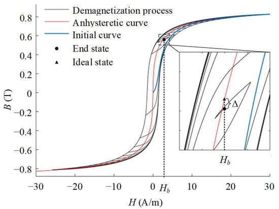 In the calculation of the anhysteretic magnetization, the effective field should be replaced by He = H + αMan. The dynamic Jiles–Atherton (J–A) model is utilized to describe the demagnetization principle and characterize the change in the magnetization state during the process as shown in Figure 1. Under the degaussing field, the magnetic flux density inside the material presents a spiral attenuation, and finally lies near the AM curve corresponding to the environmental field Hb. However, in the actual situation, the end state of the demagnetization is slightly lower than the ideal state of the AM curve due to the limitation of the electromagnetic demagnetization method. Their difference ∆ can be utilized as the assessment method of the demagnetization effectiveness. After demagnetization, the closer the magnetization state of the material is to the anhysteretic magnetization curve, the higher the permeability is, and the better the demagnetization effectiveness is.