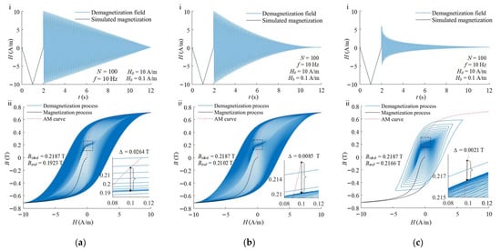 The different envelope attenuation functions of degaussing field change the energy distribution in the reversible and irreversible range of the shielding material during demagnetization. The waveforms of degaussing field with different envelope attenuation function and the calculated results are illustrated in Figure 2. The simulated magnetization, demagnetization processes and AM curve are represented by the black lines, blue lines and red dotted lines, respectively. Since the logarithmic attenuation function decays quickly, the first period of degaussing field is smaller than that of the other two waveforms with the same parameter of initial amplitude H0. After demagnetizations with the linear, second-order and logarithmic attenuation function, the magnetic flux density within the material are 0.1923 T, 0.2102 T and 0.2166 T corresponding to the bias field of Hb, respectively. The ideal state on the AM curve reaches 0.2187 T calculated by Equation (2). The degaussing field with logarithmic attenuation function is mainly concentrated in the small amplitude oscillation for the most of time, so that the decay step between the last periods is smaller compared to the other attenuation functions. Therefore, its end state is closer to the ideal state, meaning a better demagnetization effectiveness.