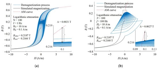 Demagnetization processes with logarithmic attenuation function and different frequency of (a) f = 1 Hz; (b) f = 100 Hz.