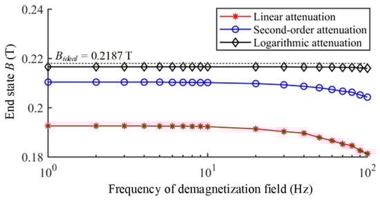 The degaussing field with higher frequency causes the increase in the eddy current loss, thus affecting the demagnetization effectiveness. The demagnetization processes with different frequency and attenuation function are also calculated by the same method. The higher frequency of degaussing field, the more eddy current losses need to be overcome during demagnetization. Taking the logarithmic attenuation function as an instance, the demagnetization processes with different frequency of f = 1 Hz and f = 100 Hz are illustrated in Figure 3. After demagnetizations of 1 Hz and 100 Hz, their end states reach 0.2166 T and 0.2160 T, respectively. With the same amplitude and period number, the excitation of magnetic flux density by 100 Hz degaussing field is less than 1 Hz, which leads to a lower efficiency in causing the magnetization state to converge into the AM curve. The end states of demagnetizations with other attenuation functions and frequencies are also calculated as shown in Figure 4. With the increase in frequency, the demagnetization effectiveness of all types of attenuation functions become worse.