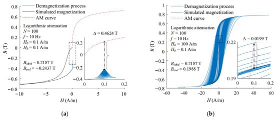 Demagnetization processes with logarithmic attenuation function and different initial amplitude of (a) H0 = 0.1 A/m and (b) H0 = 100 A/m.