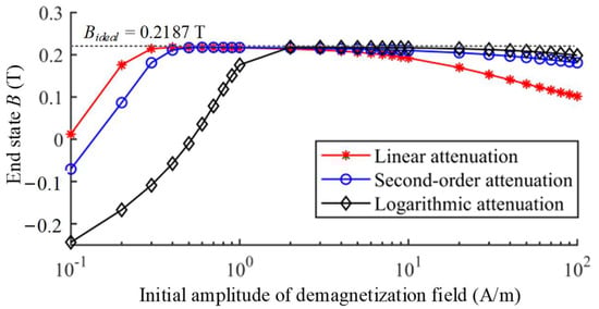 The initial amplitude of degaussing field is a crucial factor to overcome the unexpected magnetization of the magnetic-shielding material. The influence of the initial amplitude on the demagnetization effectiveness is also researched. The demagnetization processes with logarithmic attenuation function and different initial amplitude of H0 = 0.1 A/m and H0 = 100 A/m are illustrated in Figure 5. After demagnetizations, their end states reach −0.2437 T and 0.1988 T, respectively. Too small initial amplitude of 0.1 A/m cannot overcome the obstacle of pinning point, resulting in poor demagnetization effectiveness. The initial amplitude of 100 A/m is sufficient to overcome the pinning effect, but result in larger attenuation steps in the last periods. Therefore, a very large initial amplitude also causes the end state after demagnetization to be slightly away from the ideal state. The calculated results of other attenuation functions with different initial amplitude are shown in Figure 6. As the initial amplitude increases, the magnetic flux density of end state increases rapidly first and then decreases slowly.