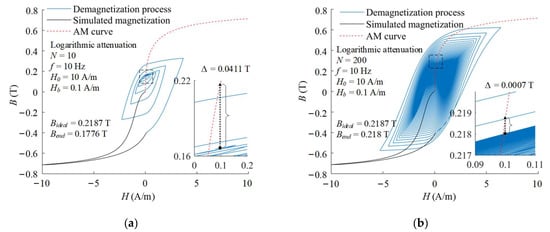 Demagnetization processes with logarithmic attenuation function and different period number of (a) N = 10 and (b) N = 200.