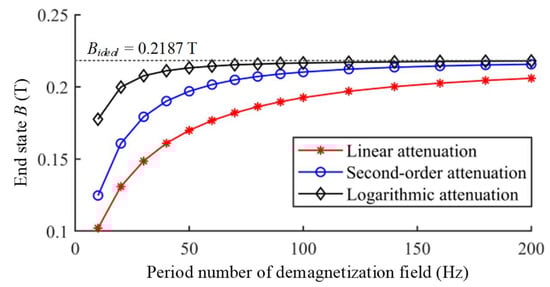 More demagnetization periods can make the shielding material closer to the magnetic equilibrium and achieve better demagnetization effectiveness. It can be seen in Figure 7 that the end states after the degaussing fields with different period number of 10 and 200 reach 0.1776 T and 0.218 T, respectively. Under the conditions of suitable frequency and initial amplitude, enough demagnetization periods can make the end state basically consistent with the ideal state. For the logarithmic attenuation, when the period number is more than 100, the end magnetization state reaches 99% of the theoretical value, which can be considered as basically achieving the ideal demagnetization effectiveness. The demagnetization effectiveness of other attenuation functions with different period number are also calculated as shown in Figure 8. With the increase in the period number, the end state after demagnetization of different attenuation functions all tend to be on the AM curve corresponding to the bias field.