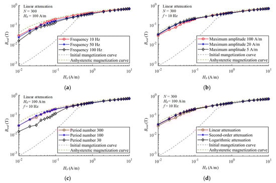 Adjusting the demagnetization parameters separately, the end states are tested under different frequency, initial amplitude, period number and attenuation function of degaussing fields, which is used to evaluate the final effect of demagnetization. Under the same bias field, the higher the flux density of the material after demagnetization is, the closer the end state is to the theoretical anhysteretic magnetization curve. The whole test flow is shown in Figure 9b. Note here that the theoretical anhysteretic magnetization curve cannot be tested due to the impossibility of ideal demagnetization, which is calculated by the anhysteretic function of the fitted J–A model.