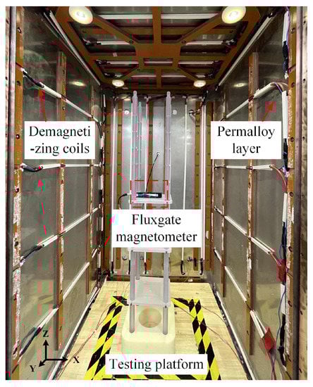 The static residual fields inside a booth-type MSR are tested to characterize its static magnetic-shielding performance after demagnetizations with different parameters. This MSR is composed of two permalloy layers with 3 mm thickness and one aluminum layer with 5 mm thickness. Its internal space size is 1050 mm × 1050 mm × 1900 mm. The fluxgate magnetometer (MAG-13, Bartington Instruments, Witney, UK) with the test range of 60 μT and noise floor of 10 pT/Hz1/2 is placed on a nonmagnetic test platform to measure the residual field inside the MSR as shown in Figure 11. The zero offset of the fluxgate magnetometer is corrected by testing the two opposite directions at the same location. The central area of 600 mm × 600 mm × 600 mm is divided into 3 × 3 × 3 grids to characterize the distribution of residual field. The test signals are converted to digital signals and collected by the data acquisition module (NI-USB6366). To ensure the same magnetization state of the shielding material, the MSR are artificially magnetized by introducing a direct current of 1 A into the demagnetizing coils before demagnetization.