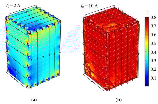 The demagnetization coils are wound on each permalloy layer using distributed winding, which can generate uniform degaussing field within the shielding layers compared with the common I-coil and L-coil [24]. Based on COMSOL Multiphysics 6.0 software, the distribution of the degaussing field inside the outermost shielding layer is calculated based on Maxwell’s equations. In simulation, the geometric model of the outermost permalloy layer is established according to the actual size of the MSR, and the measured IM curve is select as the magnetic property of the shielding material. Due to the very thin thickness of the shielding layer, this domain is divided into free tetrahedral meshes with the minimum size of 0.5 mm. The wires of the demagnetizing coils as calculated as “edge current” module, and the excited current values are set to 2 A and 10 A, respectively. In order to reduce the influence of the magnetic insulating boundary condition, an infinite element domain is established on the outermost surface of the computational domain. It can be seen in Figure 12 that, under the current of 2 A, the degaussing field is unevenly distributed in the shielding layer, especially at the edges and corners. Setting the current to 10 A, most areas of the shielding layer reach the magnetic saturation.