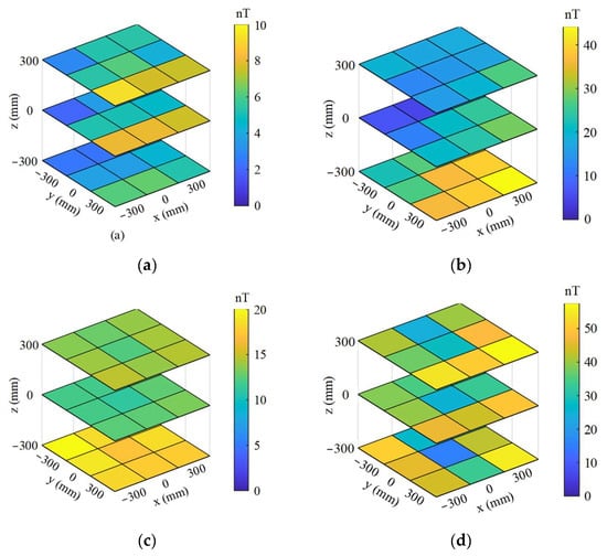 Distribution of residual field inside the booth-type MSR after demagnetization with logarithmic attenuation envelope function and different other parameters: (a) f = 10 Hz, N = 100, I0 = 10 A; (b) f = 10 Hz, N = 100, I0 = 2 A; (c) f = 50 Hz, N = 100, I0 = 10 A; (d) f = 10 Hz, N = 10, I0 = 10 A.