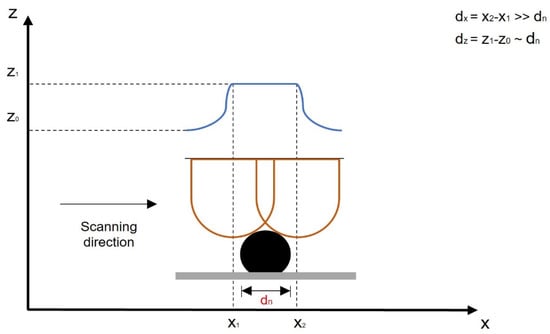 The cantilever tip moves from left to right over the scanning area and the z coordinate (cantilever tip height) is recorded. If we measure the diameter of the grain as the apparent horizontal diameter: