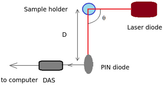 Figure 3 illustrates the basic setup of a DLS system. The coherent light source, which, for this work, was a laser diode, emits light at a wavelength of 635 nm. The power source was a rechargeable Pb battery of 7 Ah capacity to avoid any possible electric noise being produced by the modulation of the Laser beam, which might add noise to the recorded time series. The recording angle θ, also called the scattering angle, can be adjusted by changing the detector position from 0 to 180°.