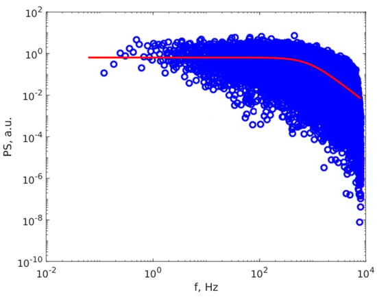 The DLS sizing procedure continues with a least square fit of the Lorentzian line, described by Equation (3), to the PS calculated using the FFT algorithm. The fit outputs the a0 and a1 parameters. The a0 parameter scales the line to match the plateau on the double logarithmic plot of the PS versus frequency, as illustrated in Figure 5, while the a1 parameter is used to assess the average diameter of the suspended particles.